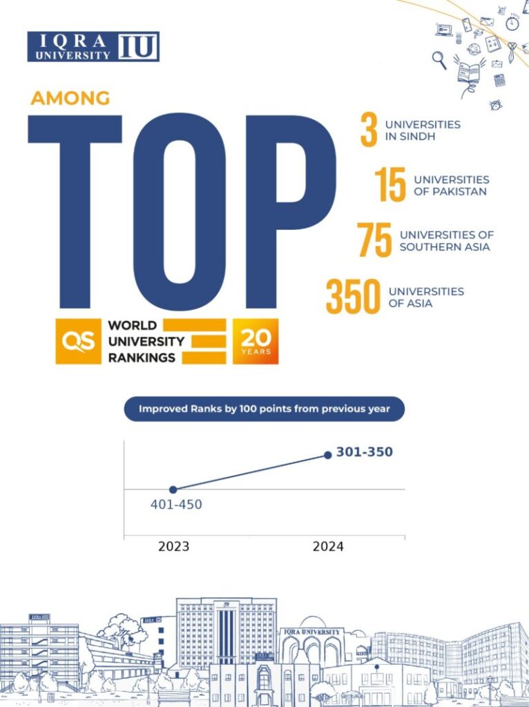 Our commitment to excellence keeps growing stronger with each passing year. We proudlyannounce that we are ranked among the top institutions in Sindh, Pakistan, and Asia by QSWorld University Rankings.We appreciate all staff, faculty, and students for their efforts, dedication, and contributionsthat have driven us 100 points higher in this journey of excellence.