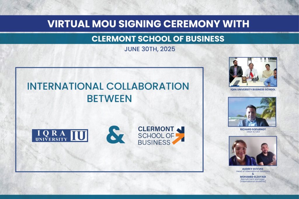 On June 30, 2025, the International Office of Iqra University proudly hosted a virtual Memorandum of Understanding (MoU) signing ceremony with the prestigious Clermont School of Business, France. This landmark agreement marks another step forward in IU’s mission to expand international academic partnerships and create enriching opportunities for students and faculty alike. The ceremony was […]