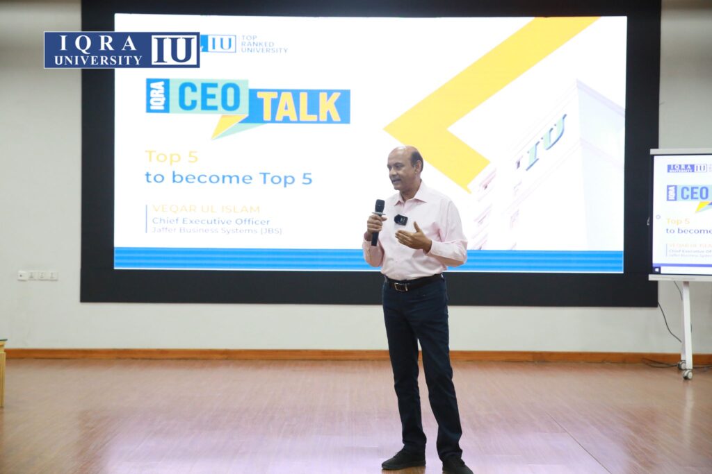 Iqra University organized the highly anticipated “Top 5 to Become Top 5” CEO Talk, featuring Veqar ul Islam, the CEO of Jaffer Business Systems (JBS). Mr Islam shared his hard-won wisdom from his 38-year career with students, outlining the top 5 life lessons that propelled him to success.
