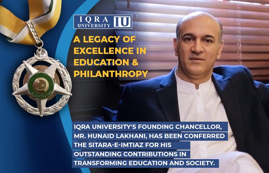In a prestigious ceremony held at the Governor House, Karachi, on Sunday, Sindh Governor Kamran Khan Tessori conferred the Sitara-e-Imtiaz upon distinguished individuals from various fields. Among those honored was Mr. Hunaid Lakhani (late), Founding Chancellor of Iqra University, in recognition of his exceptional contributions to education, healthcare, and social well-being in Pakistan.