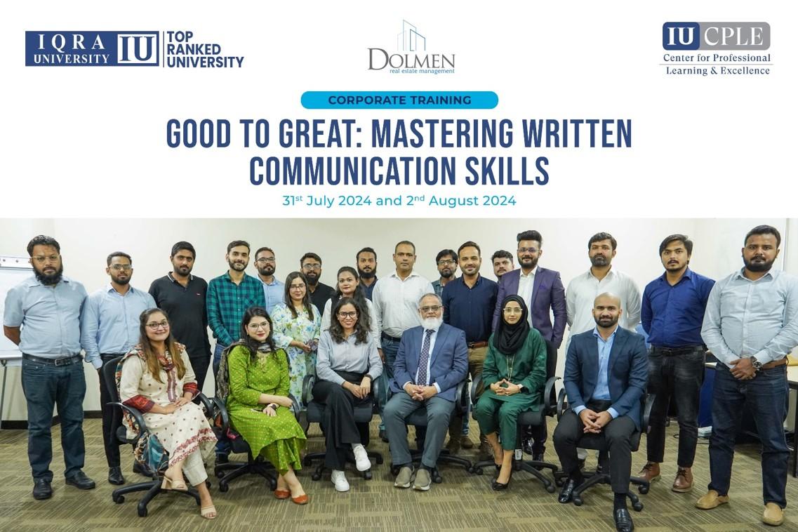 On July 31 & August 02, 2024, the training program on Effective Communication Skills, organized by Iqra University’s Center for Professional Learning and Excellence (CPLE), was designed to enhance the communication capabilities of mid-level employees from Dolmen Group. The two-day program focused on written communication skills, including business writing, email etiquette, and the use of AI tools such as ChatGPT to improve efficiency. The training was facilitated by experienced trainers: Aseem Majid Rizvi and Madiha Munaf, who provided hands-on learning opportunities. The program concluded with a post-training assessment to gauge improvement, and feedback sessions were conducted to ensure the alignment of the training with participants’ needs.
