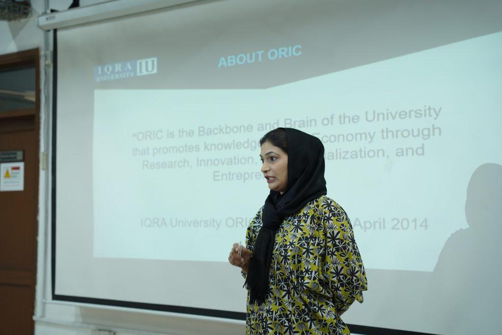 The Office of Research, Innovation, and Commercialization (ORIC) at IQRA University conducted highly anticipated interactive sessions led by Ms. Zareesh Zahra, the Manager of ORIC. These sessions took place across various faculties of the IU Main Campus, including the Faculty of Engineering, Science & Technology (FEST), Media Sciences, and Management Sciences, reflecting ORIC’s commitment to engaging with diverse academic disciplines.