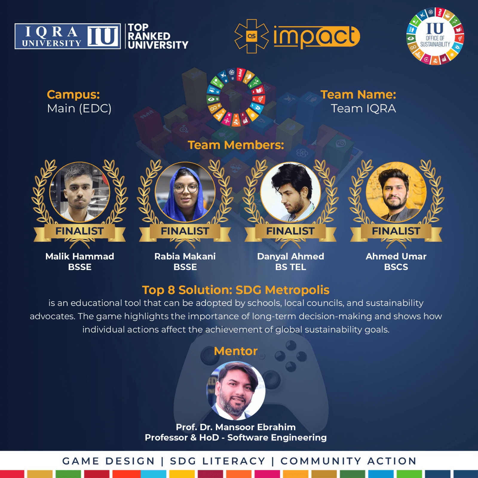 Comprising talented students Malik Hammad (BSSE), Rabia Makani (BSSE), Danyal Ahmed (BS TEL), and Ahmed Umar (BSCS), Team IQRA has showcased exemplary teamwork, dedication, and creativity under the mentorship of Prof. Dr. Mansoor Ebrahim, Head of Software Engineering at Iqra University.